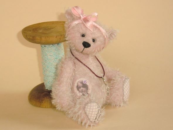 Auf meinem Bauch ist ein nostalgisches Mädchenbild mit rosa Strasstein aufgenäht. Eine Haarschleife in rosa und mein Schlüsselchen um den Hals gehören ebenfalls zu mir.