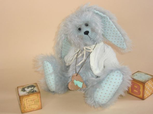 Ich bin ca. 25 cm groß und einem hellblau-grauen, wuscheligen Mohair handgefertigt.