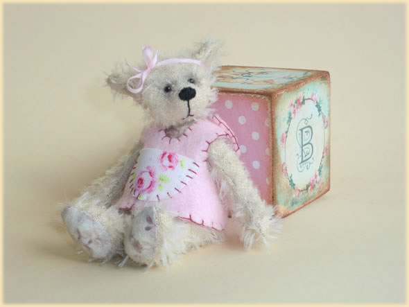 Ich bin ca. 8 cm groß und aus cremefarbenem Mohair handgenäht. Am liebsten trage ich mein Filzkleidchen mit Blümchentasche darauf in meiner Lieblingsfarbe, rosa. Mein rosa Schleifchen darf aber auf keinen Fall fehlen.