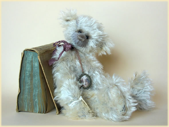 Ich bin ein schwerer Schlenkerbär, ca. 27 cm groß und aus beigem Langhaarmohair handgenäht. Mein nostalgisches Amulett und die lila-braune Schleife trage ich immer um meinen Hals.