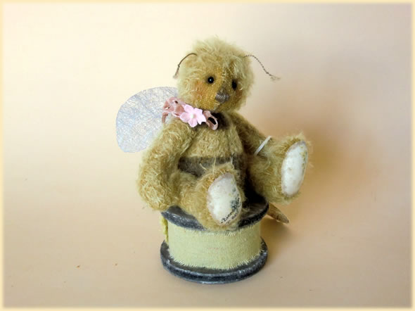 Ich bin ca. 14 cm groß und aus blondem, verfilztem Mohair gefertigt. Meine Streifen wurden dunkelbraun eingefärbt. Als kleine Biene habe ich natürlich auch glitzernde Vlies-Flügelchen. Außerdem trage ich eine rosa Schleife mit Blümchen.