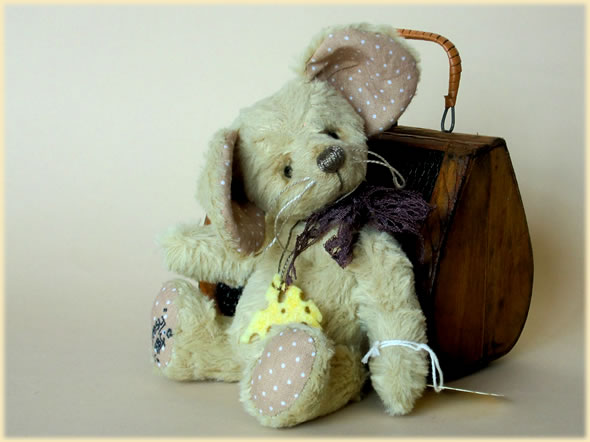 Ich bin ca. 14 cm groß und aus beiger Viskose handgefertigt. Mit einem braunen Spitzenschleifchen und meinem Käse um den Hals bin ich für alles gerüstet.