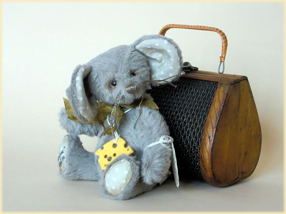 Ich bin wie meine Schwester CHEESY ca. 14 cm groß und aus grau-brauner Viskose handgenäht. Auch zu meiner Ausstattung gehört eine messingfarbene Schleife und ein Käse als Notration.