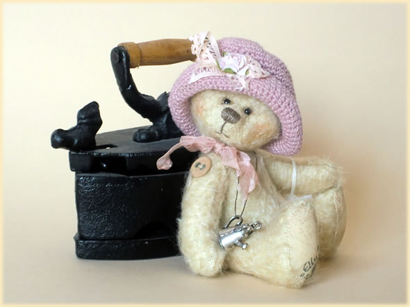 Ich bin ca. 12 cm groß und aus cremefarbenem verfilztem Mohair handgefertigt. Meine aufgenähten Knöpfgelenke habe ich nur zur Deko. Als romantisches Blumenbärchen habe ich immer meinen roséfarbenen Häkelhut mit Blümchen, meine rosa Schleife und ein Gießkännchen als Anhänger dabei.