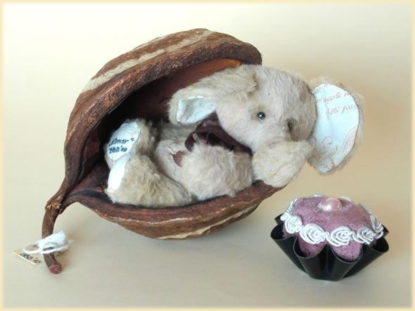 Ich bin ca. 11 cm groß und aus hellbrauner Viskose handgenäht. Mit meiner braunen Schleife fühle ich mich in der Nussschale pudelwohl.