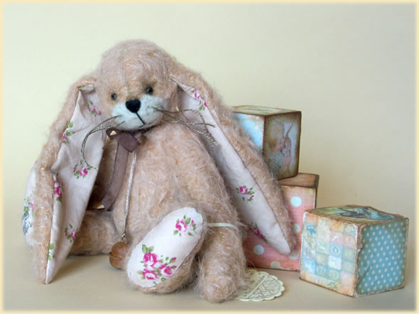 Ich bin ca. 18 cm groß und aus hellapricotfarbenem stark verfilztem Mohair handgefertigt. Mein Schnauzenteil wurde mit beiger Filzwolle gefilzt. Da ich nur ein braunes Schleifchen und ein verrostetes Glöckchen um den Hals habe, kommen meine geblümten Ohrinnenteile und meine Sohlen besonders gut zur Geltung.