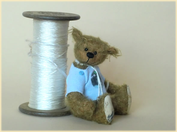 Ich bin ca. 10 cm groß und aus zimtfarbenem verfilztem Mohair handgenäht. Mein hellblauer Pulli mit nostalgischem Aufdruck und Knöpfen, sowie mein Schlüsselchen gehören auch zu mir.