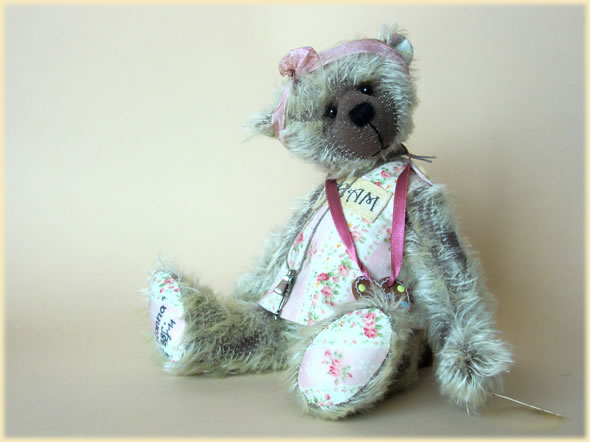 Ich bin ca. 23 cm groß und aus beige-braunem Mohair, das zum Teil stark rasiert wurde, handgefertigt. Mit rosa Blumenkleid und Schleifchen bin ich stets ausgehfertig. Für ein Lebkuchenherz lass ich alles stehen und liegen.