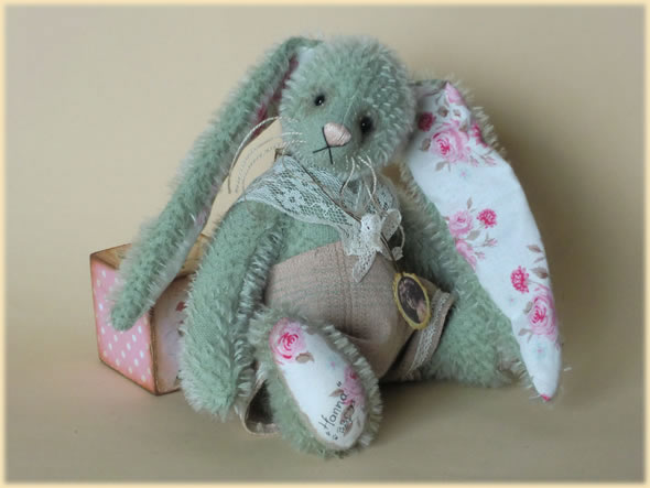 Ich bin ca. 21 cm groß und aus einem grünlichen Mohair handgefertigt. Wie ihr an meinen Ohren und Sohlen erkennen könnt, stehe ich voll auf Blümchen. So richtig romantisch wird es erst noch mit meinem rosefarbenen Overall mit breiten Spitzenträgern. Das i-Tüpfelchen ist der nostalgische Anhänger.