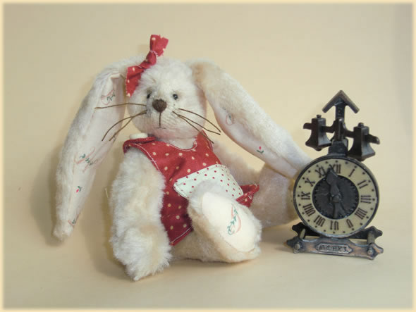 Ich bin ca. 12 cm groß und aus beigem Mohair mit Seide handgenäht. Auf Punkte stehe ich total, wie man unschwer an meinem roten Schürzenkleidchen und meiner Schleife erkennen kann.