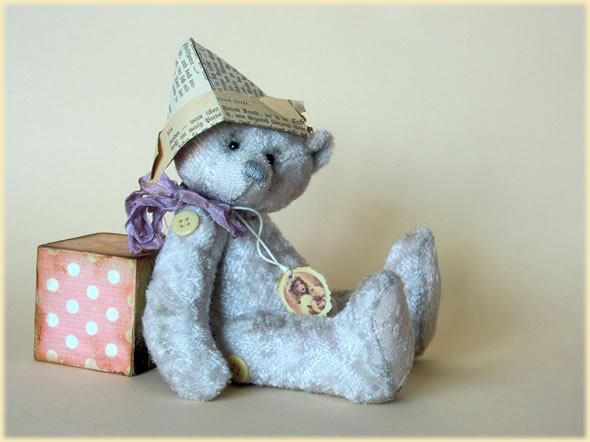 Ich bin ca. 17 cm groß und aus hellflieder-grau glänzender Viskose handgenäht. Am liebsten trage ich meinen alten Papierhut, eine violette Schleife und einen nostalgischen Papieranhänger. Meine Knopfgelenke sind nur zur Deko angenäht.