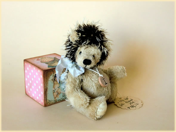 Ich bin ca. 13 cm groß und aus dunkelbraunem Stachelmohair (hell gespitzt) und beiger Viskose handgefertigt. Mein hellblaues Schleifchen und mein Holzanhänger mit meinem Anfangsbuchstaben, sowie mein glitzernder Bauchnabel machen mich als stacheligen Gesellen schon fast zum Softie.
