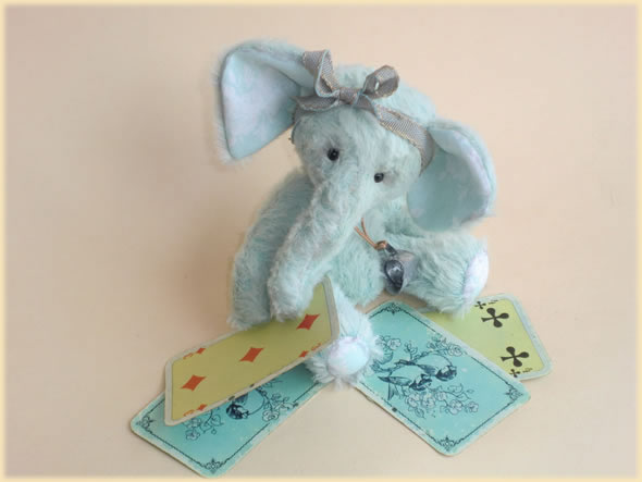 Ich bin ca. 12 cm groß und aus hellblauer Viskose handgefertigt. Am Kopf trage ich ein passendes Schleifchen und um meinen Hals ein kleines Metallkännchen.