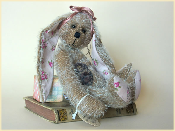 Ich bin ca. 22 cm groß und aus beige-braunem sparse Mohair handgearbeitet, das aber noch zusätzlich ausgedünnt wurde. Das Blümchenmuster meiner Sohlen und Ohren verstärkt mein verspieltes Äußeres noch zusätzlich neben dem Schleifchen und dem nostalgischen Bügelbild.