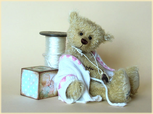 Ich bin ca. 17 cm groß und aus hellblondem sparse Mohair handgenäht. Am liebsten trage ich mein creme/rosafarbenes Jäckchen, das mir noch etwas zu groß ist, und einen nostalgischen Papieranhänger.