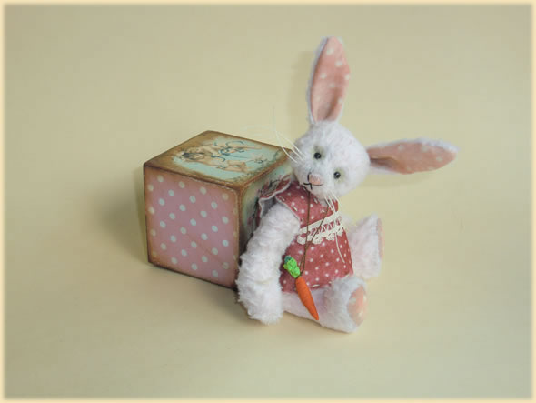 Ich bin ca. 10 cm groß und aus hellrosa Viskose handgenäht. Ich liebe mein rot-beige gepunktetes Schürzenkleidchen und für den Notfall habe ich immer eine Karotte dabei.