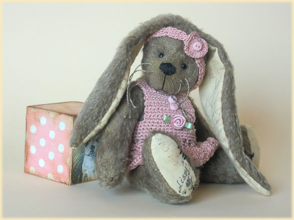 Ich bin ca. 16 cm groß und aus schlammbraunem leicht verfilztem Mohair handgefertigt. Am liebsten trage ich mein altrosa Häkelkleid mit dem dazugehörigen Stirnband.