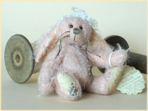 Ich bin ca. 10 cm groß und aus lachsfarbenem verfilztem Mohair handgefertigt. Als angehendes Prinzesschen habe ich ein Schleifchen auf dem Kopf und ein Krönchen um den Hals.