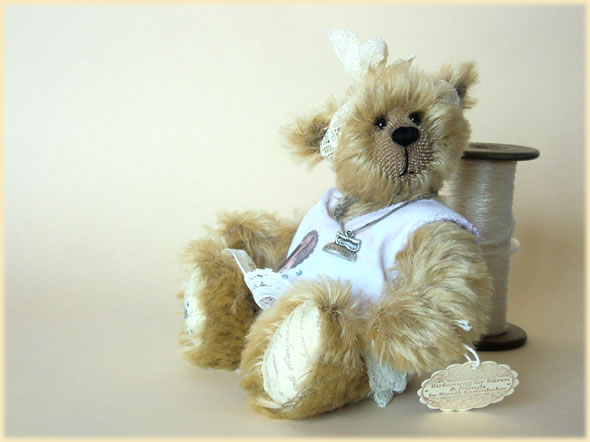 Ich bin ca. 17 cm groß und aus hellbraunem, wuscheligem Mohair handgefertigt. Mein Outfit besteht aus einem roséfarbenen Kleidchen mit nostalgischem Motiv und Spitze, sowie einem Schleifchen auf dem Kopf und einem Bügeleisenanhänger.