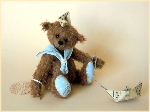 Ich bin ca. 14 cm groß und aus kastanienfarbenem sparse Mohair handgefertigt. Am liebsten trage ich meinen hellblauen Matrosenkragen und ein Papierschiffchen auf dem Kopf. Ein größeres Papierschiffchen habe ich auch zum Spielen immer dabei.