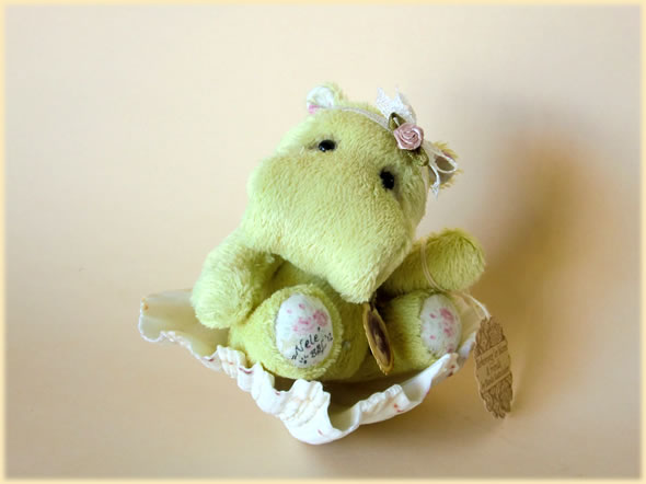 Ich bin ca. 13 cm groß und aus hellgrüner Viskose handgenäht. Als Romantikerin trage ich ein Spitzenhaarband mit Blümchen, einen nostalgischen Anhäger und ein kleines Schlüsselchen; - nicht zu vergessen: mein glitzernder Bauchnabel.