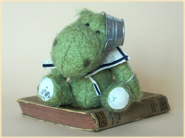 Ich bin ca. 14 cm groß und aus grünem verfilztem Mohair handgearbeitet. Matrosenkragen und Zinkwanne sind meine Ausrüstung, um für jeden Tag gewappnet zu sein.