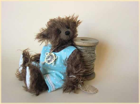 Ich bin ca. 20 cm groß und bin aus dunkelbraunem Zottelmohair handgefertigt. Mein hellblauer Overall mit weißen Punkten hat eine beige Schleife. Passend dazu habe ich einen kleinen Nostalgieanhänger.
