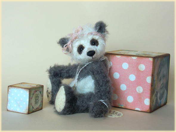 Ich bin mit meinen 18 cm Mama Panda und aus creme und braun-grauem verfilztem Mohair handgearbeitet. Meine Augen sind mit dunkelbrauner Filzwolle hinterlegt. Am Kopf trage ich eine rosa Haarschleife und um den Hals „Mit Liebe gemacht“.