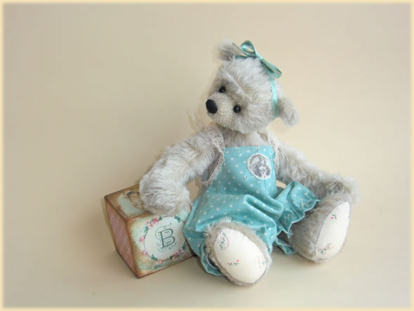 Ich bin ca. 20 cm groß und aus beigem, leicht geknautschtem Mohair handgefertigt. Am liebsten trage ich meinen petrolfarbenen Overall mit Spitzchen und einem nostalgischen Kinderbild darauf. Und meine Schleife am Kopf darf auch nicht fehlen.