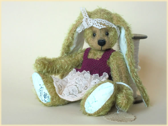 Ich bin ca. 16 cm groß und aus messingfarbenem sparse Mohair handgearbeitet. Mein Schleifchen auf dem Kopf und mein bordeaux/cremefarbenes Spitzenkleid sind mein Markenzeichen.