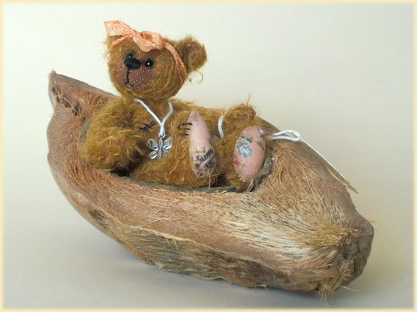 Ich bin ca. 10 cm groß und aus kupferfarbenem verfilztem Mohair handgefertigt. Am liebsten liege ich mit meiner orangen Schleife am Kopf in meiner großen Nussschale. Beachte bitte auch meinen glitzerigen Bauchnabel und meinen Schmetterling-Anhänger.