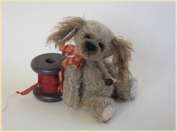 Ich bin ca. 14 cm groß und aus hell- und dunkelbraunem Mohair handgefertigt. Ich bevorzuge mein rostfarbenes Schleifchen und ein Glöckchen, dass man mich gleich sieht und auch hört.