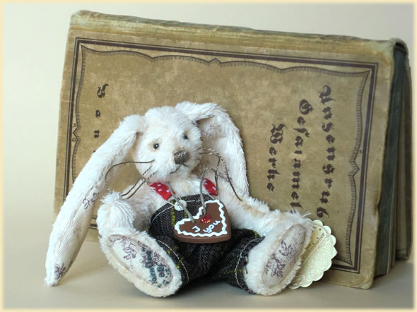 Ich bin ca. 12 cm groß und aus cremefarbener Viskose handgenäht. Mit meinem Lebkuchenherz und der braun gemusterten Hose mit den roten Trägern bin ich ein kleiner Hasencharmeur.