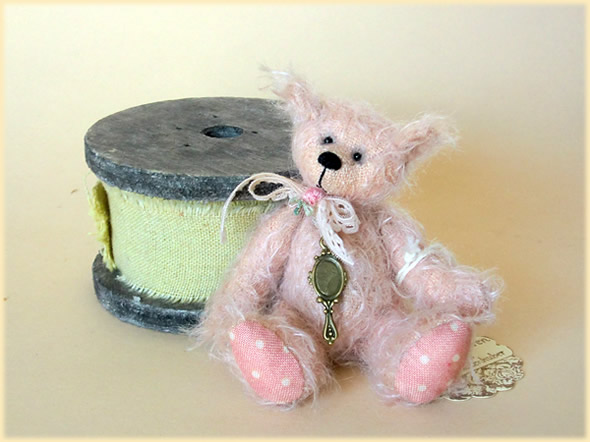Ich bin ca. 8 cm groß und aus hellrosa-farbenem, verfilztem Mohair handgenäht. Um meinen Hals ist ein zartes Spitzen- schleifchen mit einem Blümchen gebunden. Meinen kleinen Messingspiegel habe ich auch gleich umhängen.